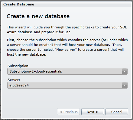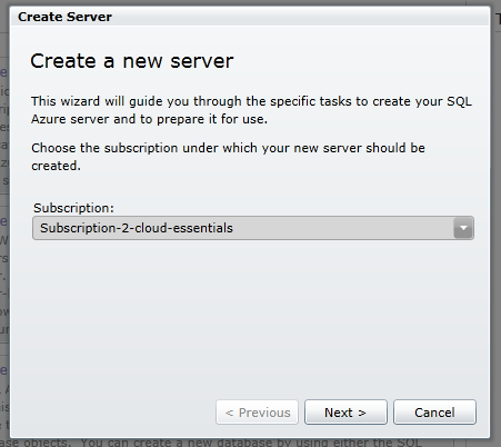 Choose your subscription then choose your server and click next. There should only be one server available in the dropdown unless you've created more than one.