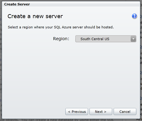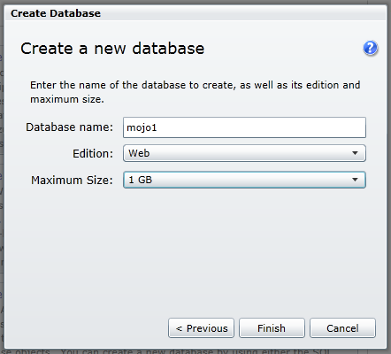 Enter a name for your database, choose the edition and size according to your expected needs, then click Finish. Once the database is provisioned you should be able to expand the subscription node in the left pane and then click the server node and you should see your database listed in the center pane. You can also edit the Firewall rules there if you need to. If you click the database name then on the right you should see a properties pane that has the fully qualified server name, you will need that as well as the admin user name and password and database name when you configure your connection string in the mojoPortal user.config file.