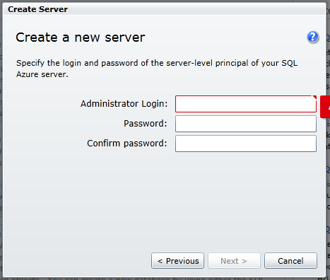 Define credentials for the SqlAzure Administrator. You must use a strong password of at least a certain length and it must have at least one upper case, one lower case, one numeric and one special character. An example of a password that meets the criteria is $Secret123 but make up your own. Be sure and write down these credentials and keep them in a safe place so you don't forget them, then click next.