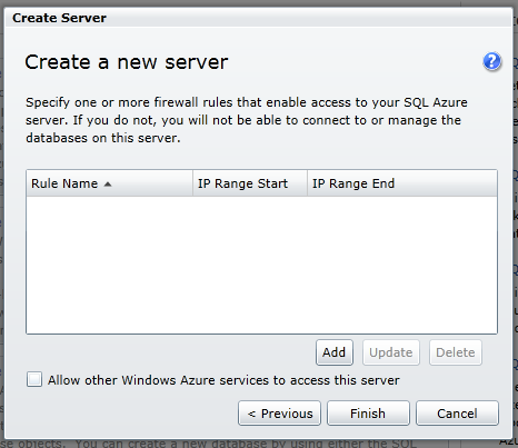 Next we create a firewall rule, if you intend to connect to the database from your local machine you would need to add a rule for your ip address. Also check the box to allow other Windows Azure services to connect to the database so that your web roles will be able to connect.