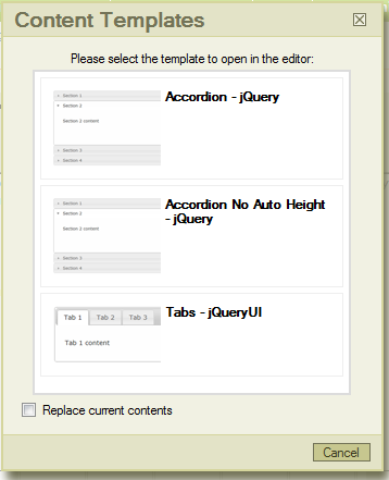 We still include some "system templates" we have defined for the jQuery Accordion and Tabs, but you can optionally remove them. By Default the system templates appear in the list before any that you create yourself. It is possible to make it show the system templates after your custom templates instead of before them or to not show them at all. The relevant web.config/user.config settings are:
