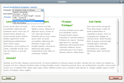 Content Templates can be created to allow easier content creation for your site content authors. mojoPortal content management system comes with a few templates and you can add custom templates (as of mojoPortal CMS version 2.3.0.8) by using the Administration Menu > Content Templates tool. You can even control which roles the templates are available to.