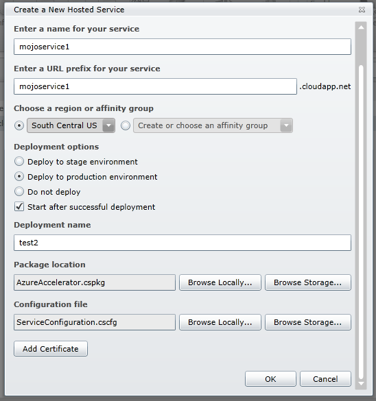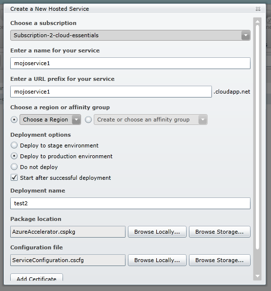 6. For the Deployment Options, choose "Deploy to Production", enter a label to identify the deployment and browse locally for the Package and Service Configuration files you extracted from the AzureHost .zip file.