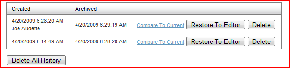 The Delete buttons only appear for Administrators or Content Administrators. You can comare any previous version side by side with the current version, and you can restore any previous version to the editor where you can save to restore it as is or modify it then save.