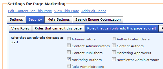 There is also a new setting in the Page Settings for marking a page as Draft. This allows editors to stubb out a new page without making it visible to the public, only members of the edit roles or draft edit roles will see the page. When the content on the draft page is submitted for approval, if the editors approve it and the page contains no other draft content then the page will automatically be published by chaging the draft flag on the page.