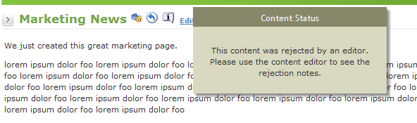 There is also an information icon which if moused over shows the current status of the draft including wheather it is currently submitted for approval or rejected. This example shows rejected content: