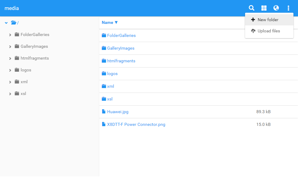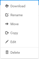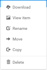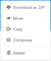 Select one item, or multiple items by holding SHIFT or CTRL when clicking on the items, then right-click on one of the items to get the context menu. Here you can delete, rename, copy, compress, extract, move, download, edit, preview, and select the item. Double-clicking on an item will select the item as well when picking a file for the WYSIWYG editor.