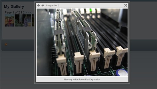Lightbox mode (default): Displays images as a series of thumbnails, optionally grouped into pages with a navigator (use the "Thumbnails Per Page" feature setting to change the paging). Clicking a thumbnail uses the Colorbox JavaScript library to show the full-sized image in a modal window with navigation buttons and the background dimmed. The image can be dismissed by using the close button, the Esc key, or clicking anywhere on the background: