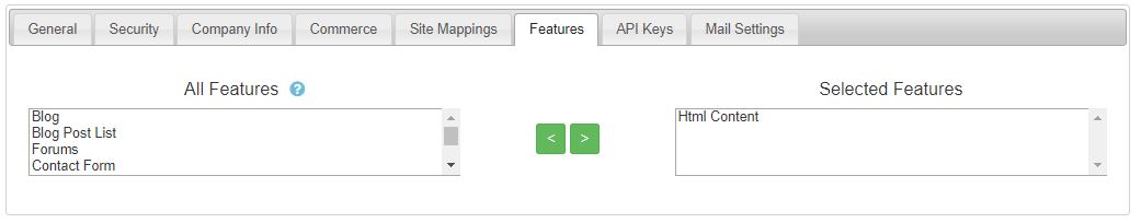 By default, new sites only have one feature available, the HTML Content Feature. To assign additional features to your sites:
