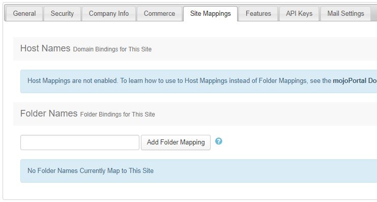 So if you want to have it work with urls like http://hostname/site2/ you would need to either make ASP.NET the default handler for all requests or make sure the folder exists and it contains a file named Default.aspx. The Default.aspx file can be just an empty text file, it doesn't need any code or contents in it, its only purpose is to get ASP.NET to handle the request. From there the mojoPortal code detects the folder mapped to the site and serves the correct content. Without doing one of these things, the only way ASP.NET will handle the request is if the url ends with Default.aspx or somepage.aspx where somepage.aspx is an url defined by the site.