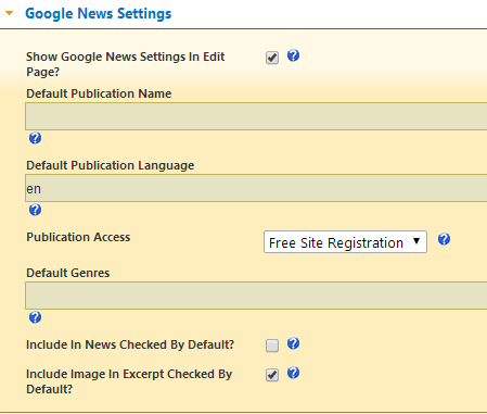 The url that you would submit to google is yoursiteroot/Blog/news-map.ashx. If you have multiple blogs in your site they will all use the same news site map but each blog has its own settings for default values of certain things such as the publication name. You must provide a publication name or your post will not be included in the news site map because this is a required element. You can also override certain settings at the post level. There is a new section of settings related to google news in the Blog settings as shown below.