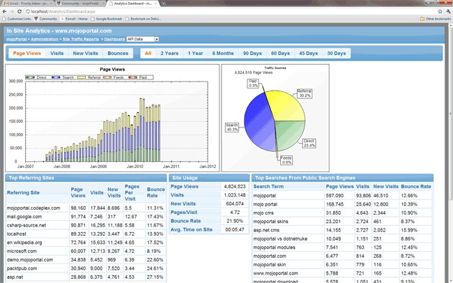 The charts and reports can work directly from the Google Analytics Data API or from the database. Only MS SQL 2005/2008/SqlAzure and MySql are supported for data capture, but installations of mojoPortal using other database platforms can still use the charts and reports directly from the API. It is also possible and preferable to use a separate database for the analytics data instead of keeping it in the same database as the site. It can be a large amount of data over time, much larger than the actual site data. You could also use any database platform for the site but still use MS SQL or MySql for In Site Analytics, it just requires you to manually run the database script(s) and change one configuration setting, see the System Requirements/Installation tab for more details.