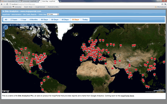 The main charts and reporting plugs into the Administration menu and is protected by roles, but there are also 2 features that plug into the mojoPortal content system to allow you to publish a traffic chart and/or visitor map on public pages of your site as I have done on our Community page.