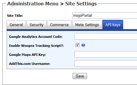 I mentioned Woopra in this previous post, its an awesome web analytics and real time traffic monitoring tool. Now its easy to use Woopra with your mojoPortal site. Just sign up for woopra and install their software on your home or office computer. Once they approve your site, you enable the script in mojoPortal from the Site Settings page as shown in this screen shot: