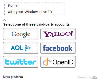 Now you can allow users to easily register and sign in to your site with no new passwords using their existing account from Google, Yahoo, AOL, Microsoft, Facebook, MySpace, Twitter and more. For complete details, see the RPX documentation here.