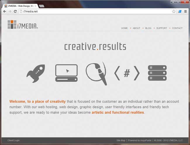 Our friends over at i7MEDIA have done lots and lots of design work with mojoPortal, and recently redesigned their own site. Not obvious from the screen shot is the mouse over menu effects on their home page, it's worth a click to check it out.