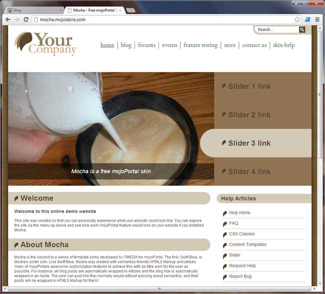 Check out the Mocha skin demo site which explains some of the features of the skin and has a download link. Its another beautiful design that shows what is possible with mojoPortal. Huge kudos to i7MEDIA for sharing this with the community!