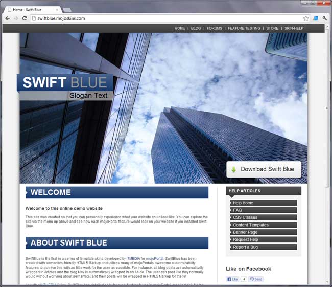 In a recent post I mentioned the new HTML 5 Skins project for mojoPortal which is aimed at getting more designers involved to produce nice modern skins for the mojoPortal community. Our friends at i7MEDIA have contributed their first skin, "Swift Blue", to the project and have setup a nice demo web site with intsructions and tips for using the Swift Blue skin.