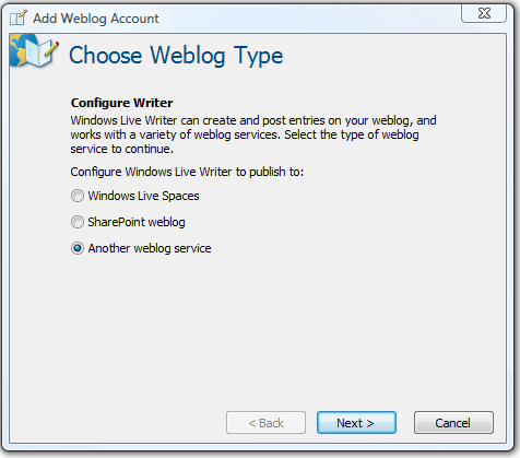 To configure, click the Weblog dropdown menu and choose "Add Weblog Account..." Then choose "Another weblog service as shown below.