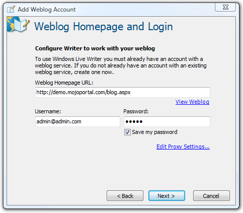 For the Weblog home page url, paste in the url for the page in your site that has the blog on it, then enter the username and password you use to sign into your mojoPortal site as shown below.