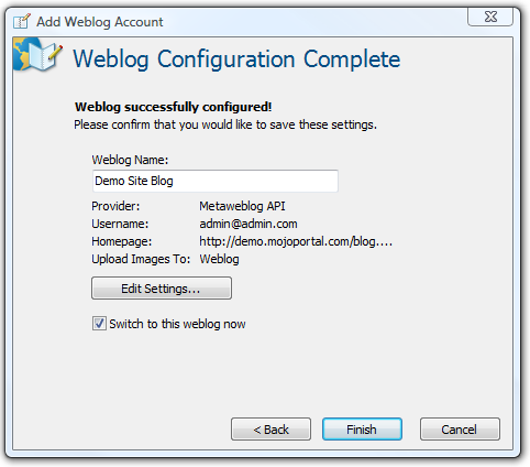 Finally give it a name to identify it in Windows Live Writer as shown below and click "Finish"