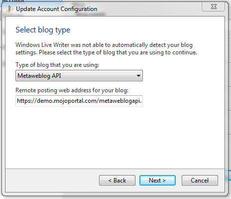 then click next. Choose Metaweblog API for the type of weblog, and for the posting url enter your site root url followed by /metaweblogapi.ashx as shown below: