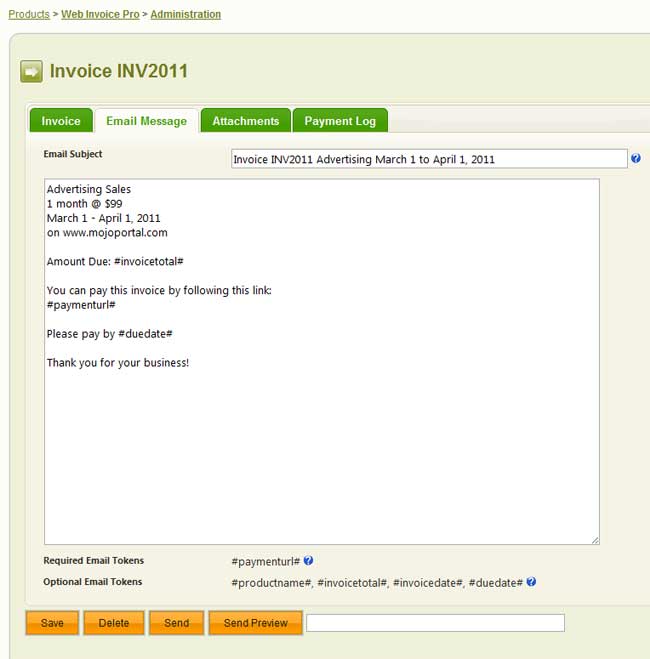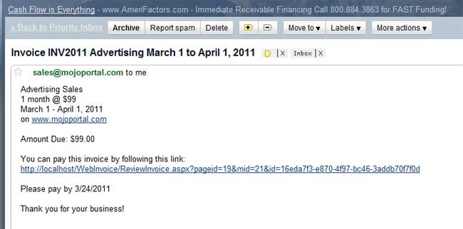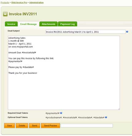 Web Invoice Pro makes it easy to send invoices by email and let your customers pay the invoice online at your web site running on mojoPortal. It provides support for receiving payments via Authorize.NET, WorldPay, PlugNPay, PayPal, and Google Checkout. A great way for freelance web designers and developers or any business to invoice their customers. You can test Web Invoice Pro on demo.mojoportal.com, so you can try it before you buy it, though of course you should only send test invoices to yourself from the demo site and the demo email messagess will have extra text in them to make it clear it came from a demo site.