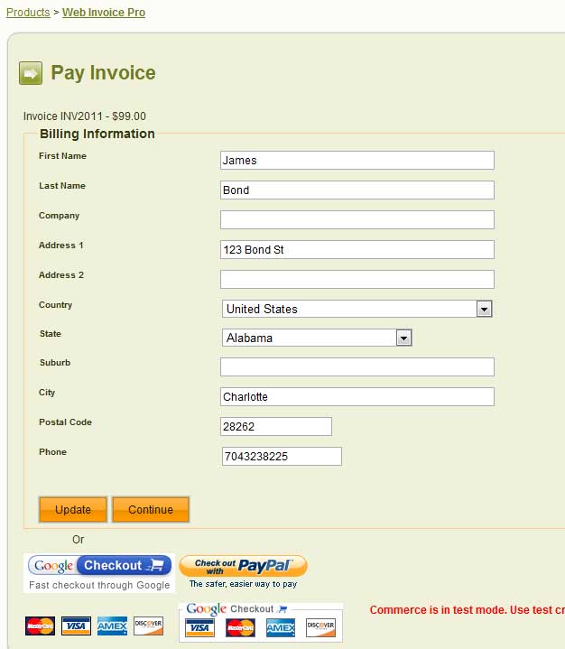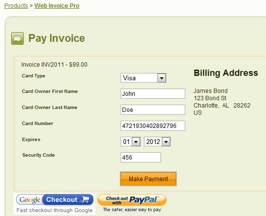 - Customers can pay the invoice online at your web site using Authorize.NET, WorldPay PayPal, and Google Checkout.