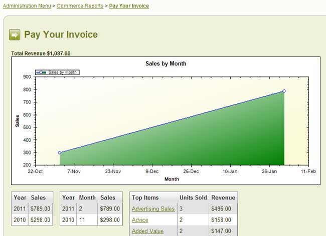 - Integrated with the mojoPortal Commerce Reports system so you get reporting and charts of your invoice revenue.
